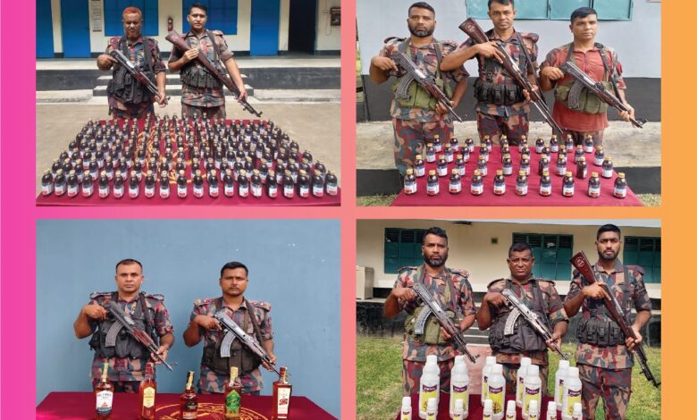 আটক মালামালের মধ্যে রয়েছে, বিদেশী মদ, ভারতীয় WINCEREX COUGH SYRUP, ড্রাগন টনিক এবং শাড়ী।