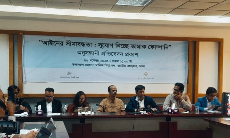 বুধবার ২৬ নভেম্বর, সকালে জাতীয় প্রেস ক্লাবের তফাজ্জল হোসেন মানিক মিয়া হলে বাংলাদেশ তামাক বিরোধী জোট ও ডাব্লিউবিবি ট্রাস্টের যৌথ উদ্যোগে “আইনের সীমাবদ্ধতা: সুযোগ নিচ্ছে তামাক কোম্পানি” শীর্ষক অনুসন্ধানী প্রতিবেদন প্রকাশ অনুষ্ঠানে বক্তারা এসব অভিমত ব্যক্ত করেন। অনুষ্ঠানে ঢাকা ট্রিবিউন ও বাংলা ট্রিবিউনের খুলনা প্রতিনিধি মো. হেদায়েৎ হোসেন মোল্লা এবং সারাবাংলা ডটনেট-এর সিনিয়র করেসপন্ডেন্ট এমদাদুল হক তুহিন গত তিন মাসের অনুসন্ধানী রিপোর্ট উপস্থাপন করেন।