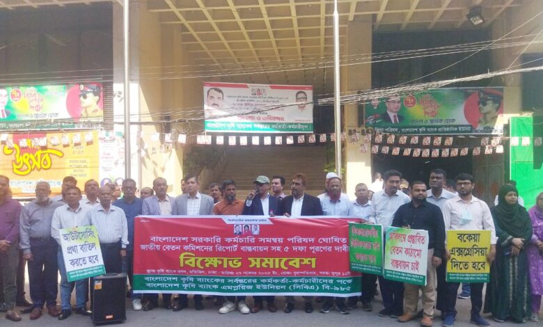 জাতীয় বেতন কমিশনের সুপারিশ বাস্তবায়নে দাবিতে কৃষি ব্যাংক কর্মচারীদের মানববন্ধন