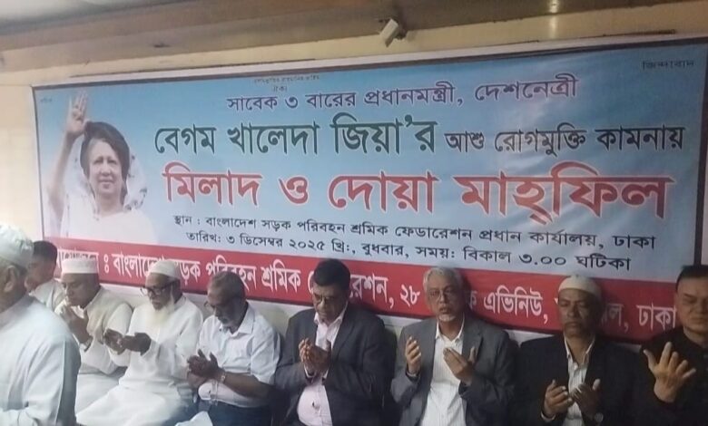 মাখদুম সামি কল্লোল: সাবেক তিনবারের প্রধানমন্ত্রী, বিএনপি চেয়ারপারসন এবং দেশনেত্রী বেগম খালেদা জিয়া’র আশু রোগমুক্তি কামনায় মিলাদ ও দোয়া মাহফিল অনুষ্ঠিত হয়েছে। বুধবার ৩ ডিসেম্বর বিকাল ৩টায় বাংলাদেশ সড়ক পরিবহন শ্রমিক ফেডারেশনের প্রধান কার্যালয়ে এ দোয়া মাহফিলের আয়োজন করা হয়। অনুষ্ঠানের আয়োজন করে বাংলাদেশ সড়ক পরিবহন শ্রমিক ফেডারেশন।